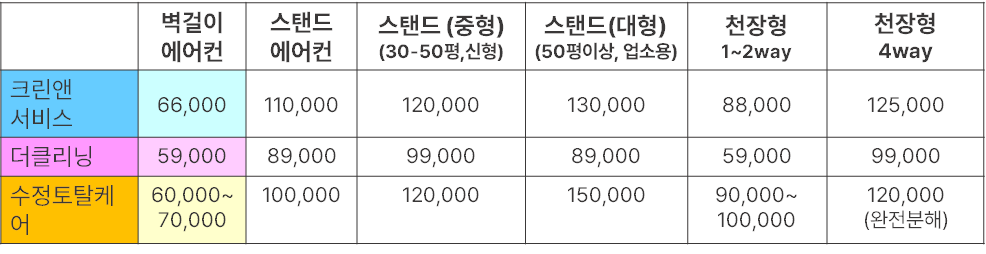 이 밖에도 에어컨 청소 전문 업체들이 있습니다. 아래는 대략적인 견적 비교입니다.